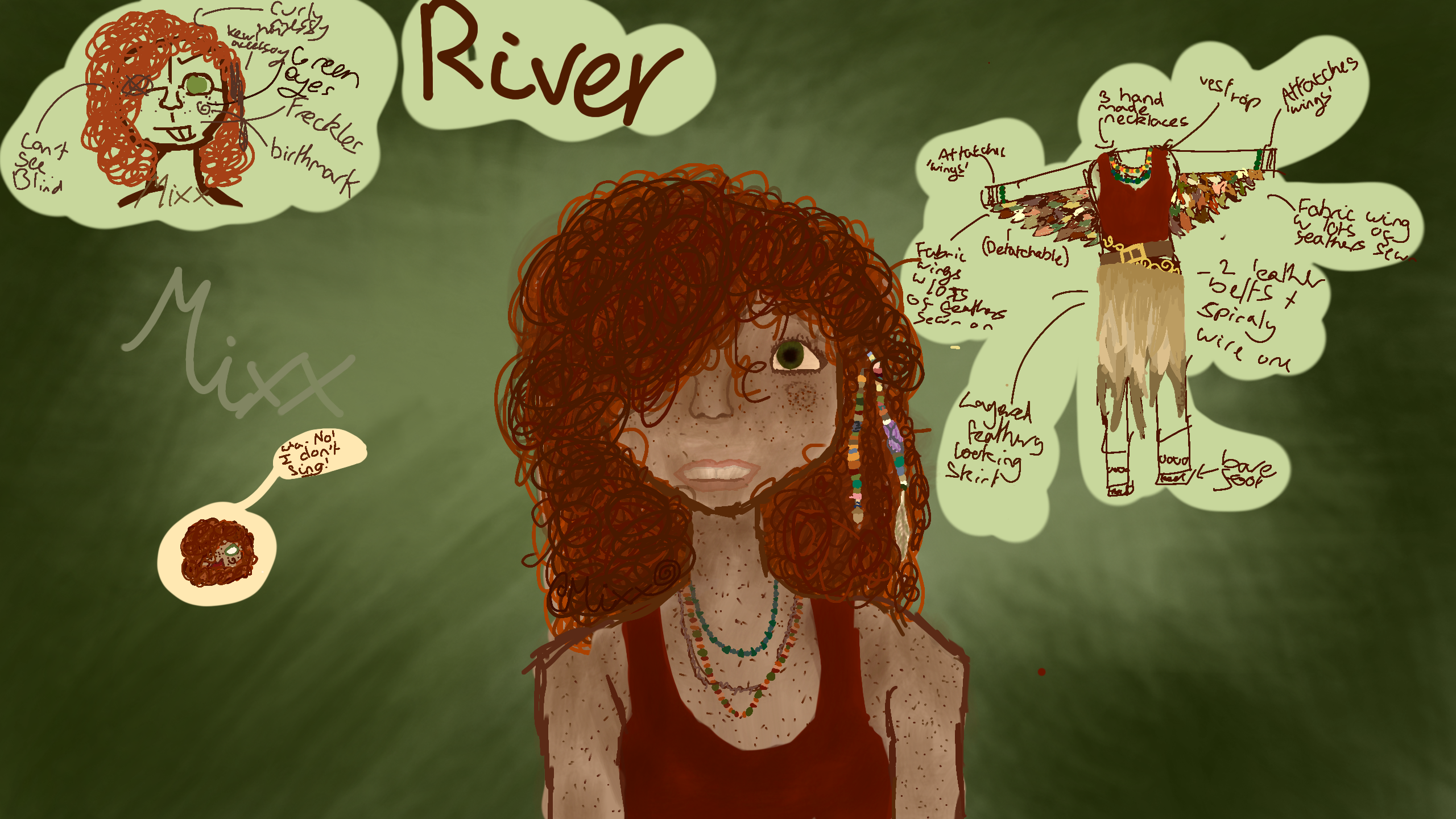 so uh meat River my #Yaelokre oc,ill write their lore properlyin another post, but here's it in short. They/it, 11, travelled meadowlark with their parent, their parent died, it didn't want to go to another 'parent' so they ran away and ended up at one of the lark's shows and was so moved they decided to try and stik around/make friends with the lark and succeded yay
