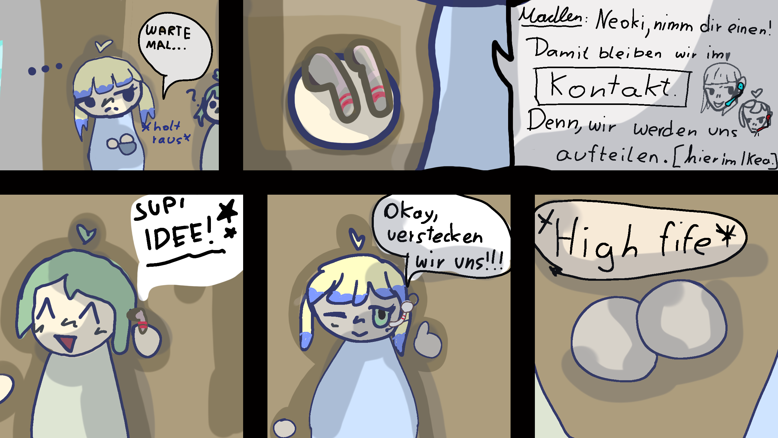Madlen und Neoki verstecken sich im Ikea von der Polizei. Sie haben eine Idee: Mit kleinen angepassten Kopfhörern (die sie anziehen) werden sie sich aufteilen unf im Kontakt bleiben.