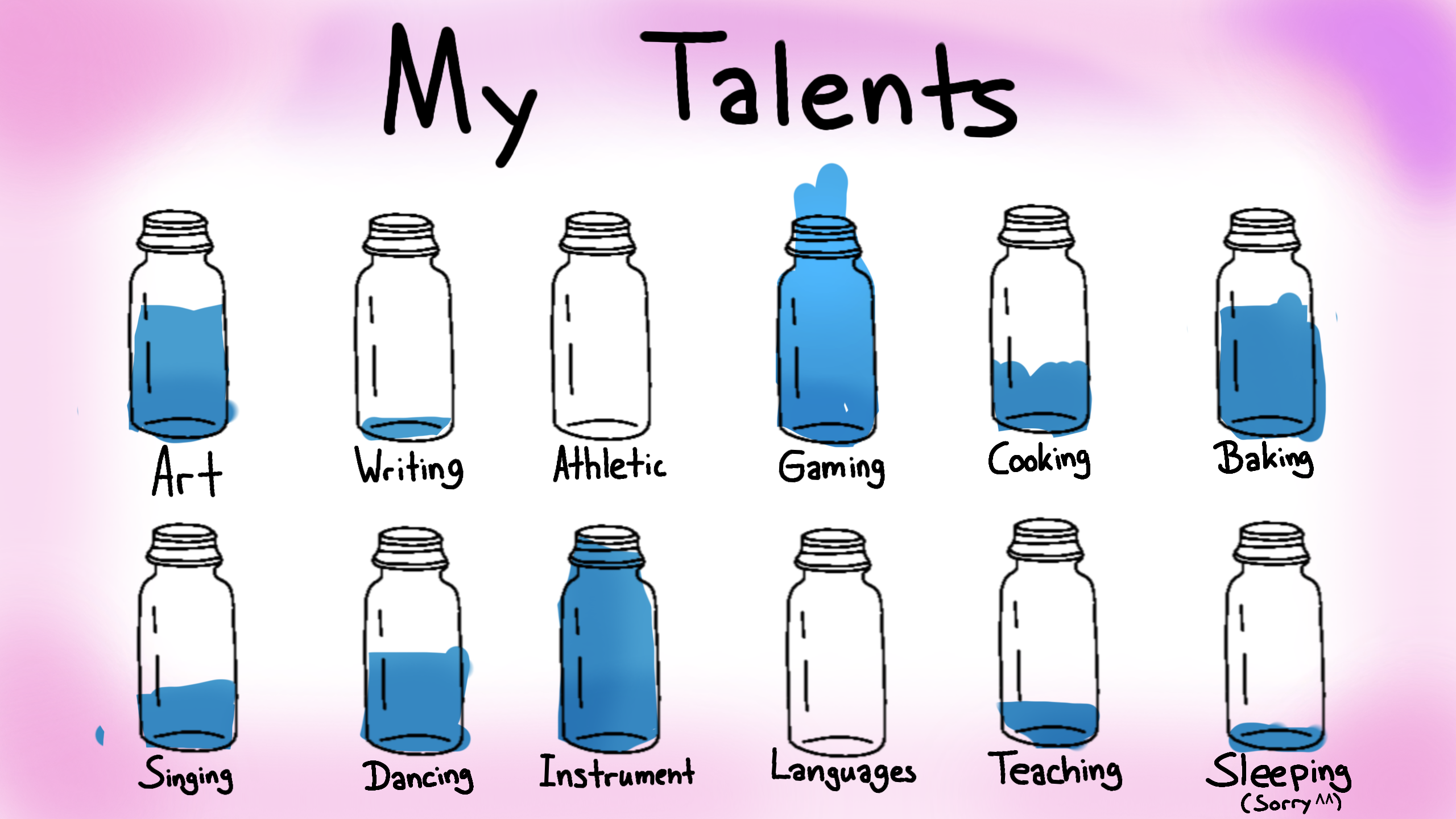 for me everything is true except for singing (0), dancing (0), instrument (1/4), and teaching (90%)
