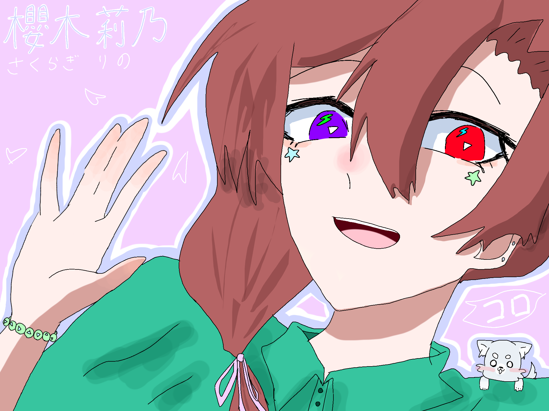 代理出来たぁ!!櫻木莉乃ちゃん!!描いてくれると嬉しいです!!!肩にいる犬は[コロ]です!可愛いでしょ!まぁ、、ペットと思ってください! #櫻木莉乃ちゃんごめんなさい今気づきました……汗 こいつは代理ではなくocです追記 銀星ありがちょ♡(キショ)