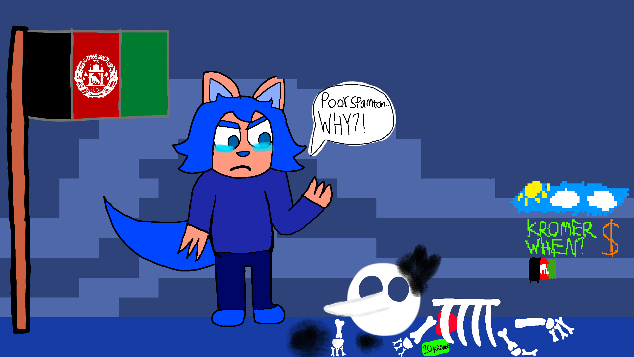 OOPS I USED THE WRONG AFGHANISTAN FLAG!! And yes, Spamton drew on the wall of the bunker. I just drew this scenario because I was SOOO BORED! TreeMoo is his girlfriend in this little drawing I did. This drawing is not meant to offend any races, it is just a drawing. I added Spamton's soul in the picture because if I didn't, it would be so cruel of me! @BIGSHOTGAMIG1997 look at this amazing artwork!