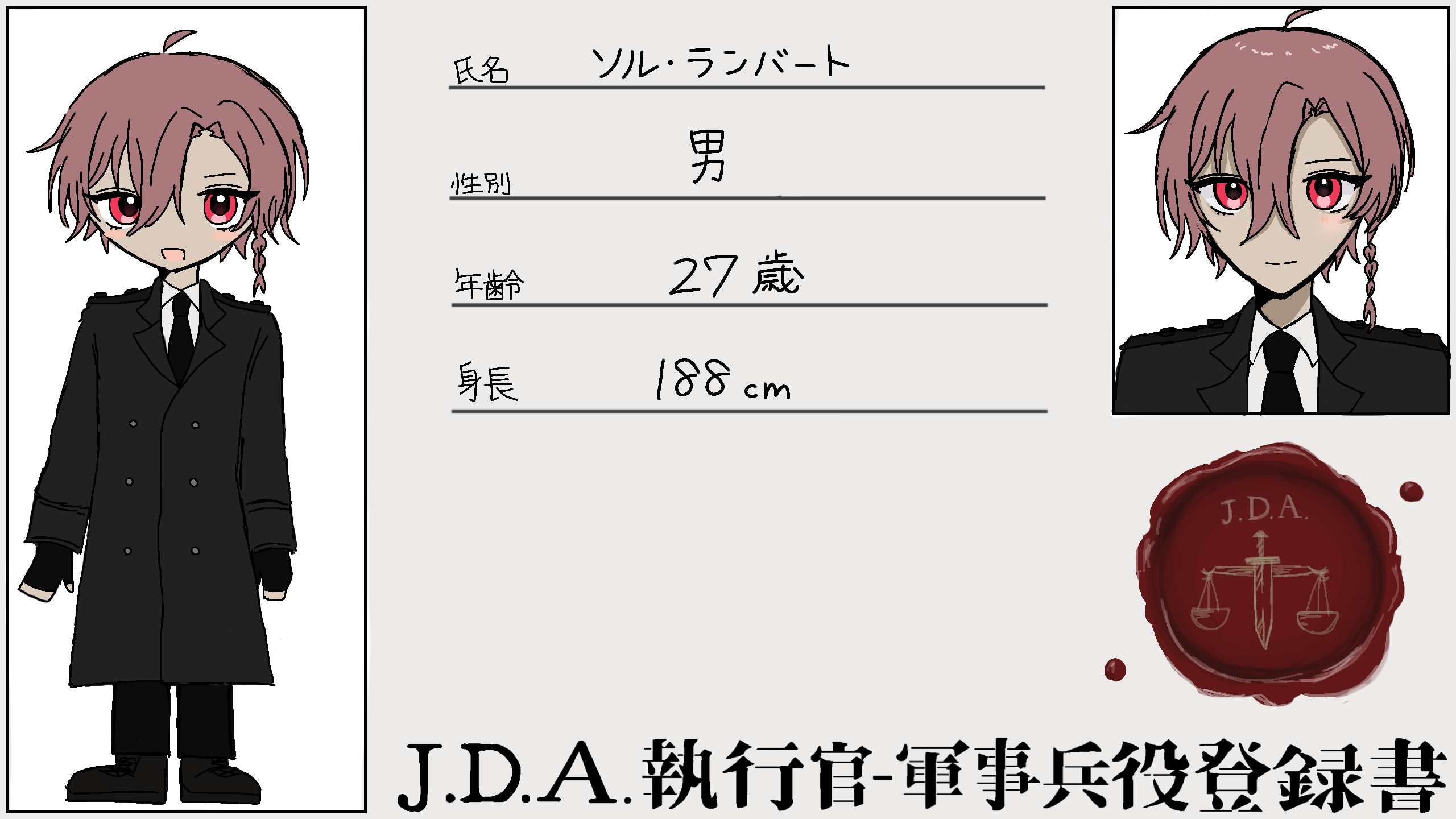 「J.D.A.執行部隊、Enforcersの隊長を務めているソル・ランバートだ。この赤い瞳とガタイの良さが目印、なんて言われてるけどな……。ハハハ! 気軽に『ソル』と呼んでくれ。君がこのチームの新しい仲間になってくれるのを、心から歓迎するよ。」