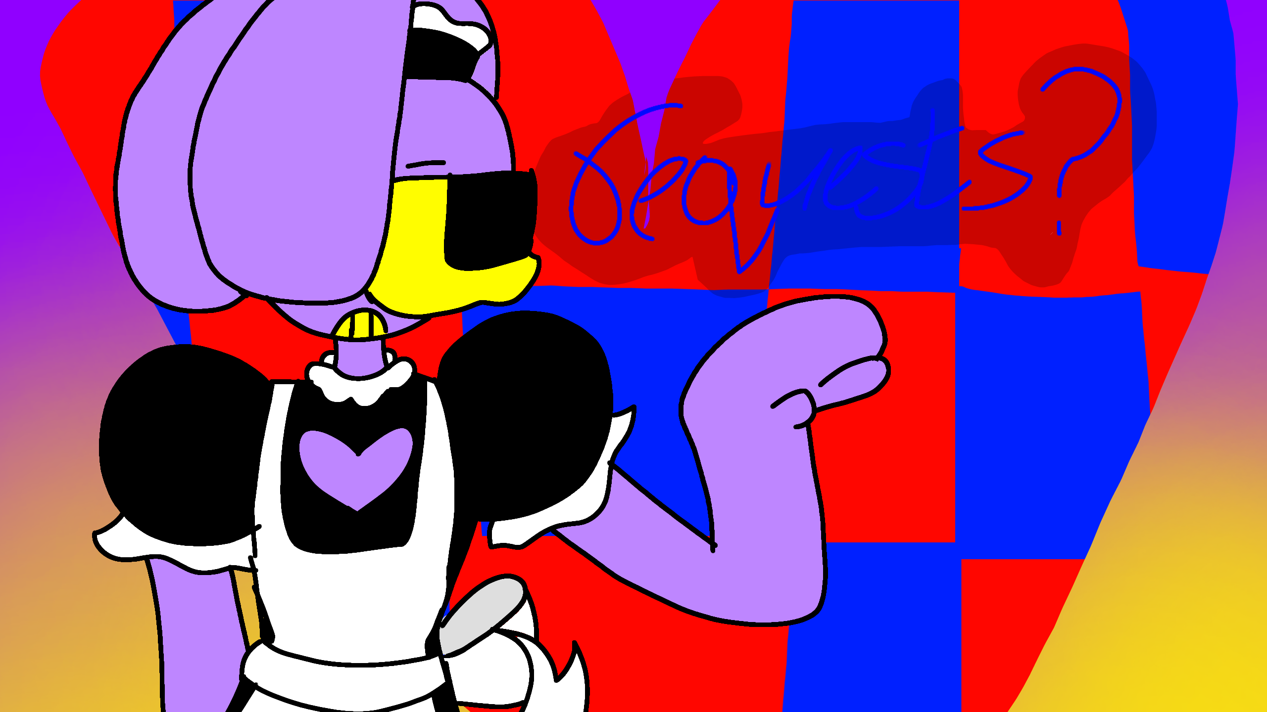 I will only do requests for TADC (the amazing digital circus), DW (Dandy's World), BBU (Billie Bust Up), and OCs (but also if you want ships of any of MY OCs that's fine too)