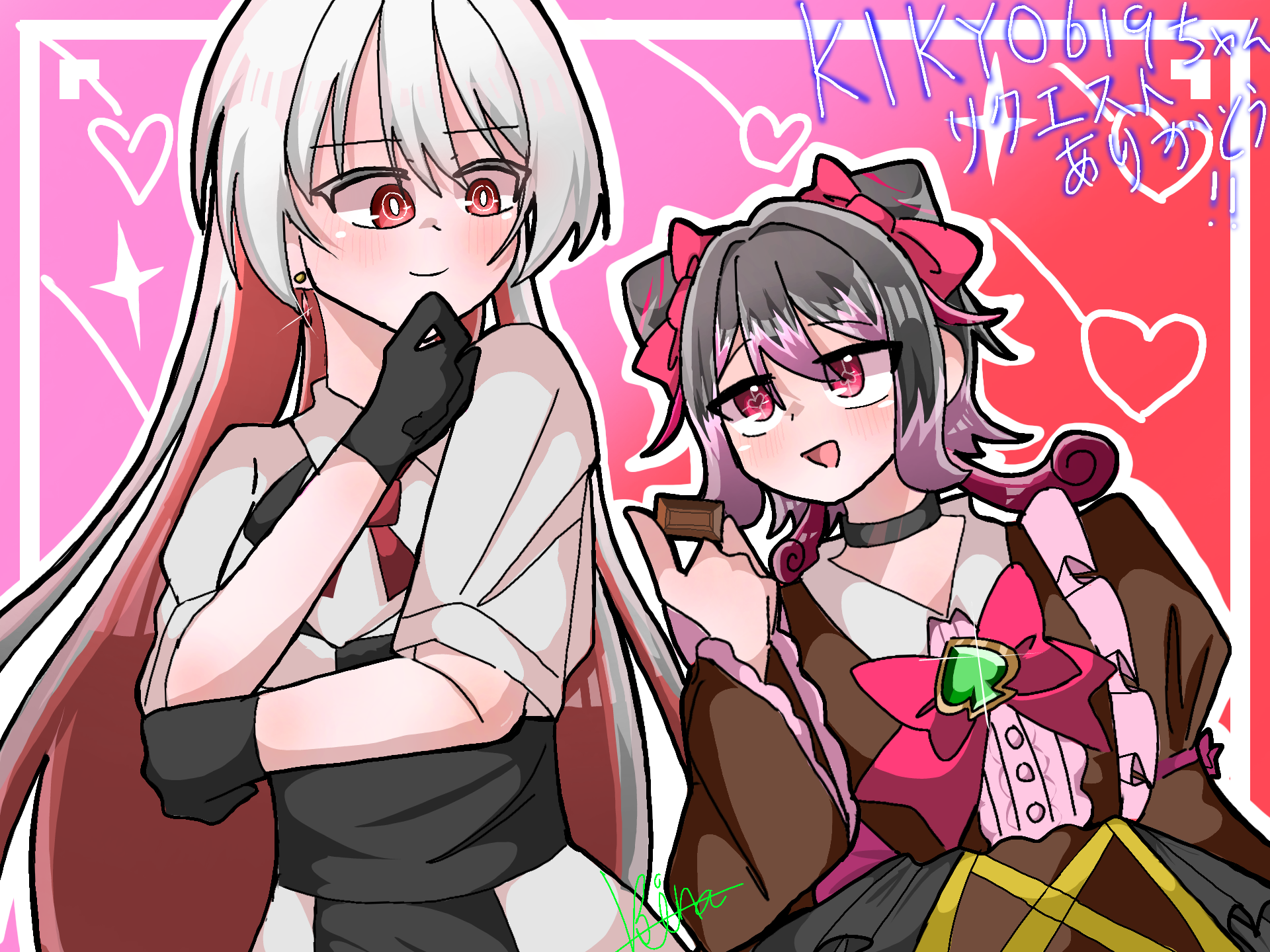 リクエストのトトキちゃんの裏の顔ちゃんとチョコちゃんです!!トトキちゃんの裏の顔ちゃんを描けて嬉しかったしお友だちにもなってくれて本当にありがとう!!!キャラデザ間違ってたらごめん!あとつけてほしいタグあれば言ってね!メッション失礼するね! @KIKYO6194/22 金星ありがとうございます!