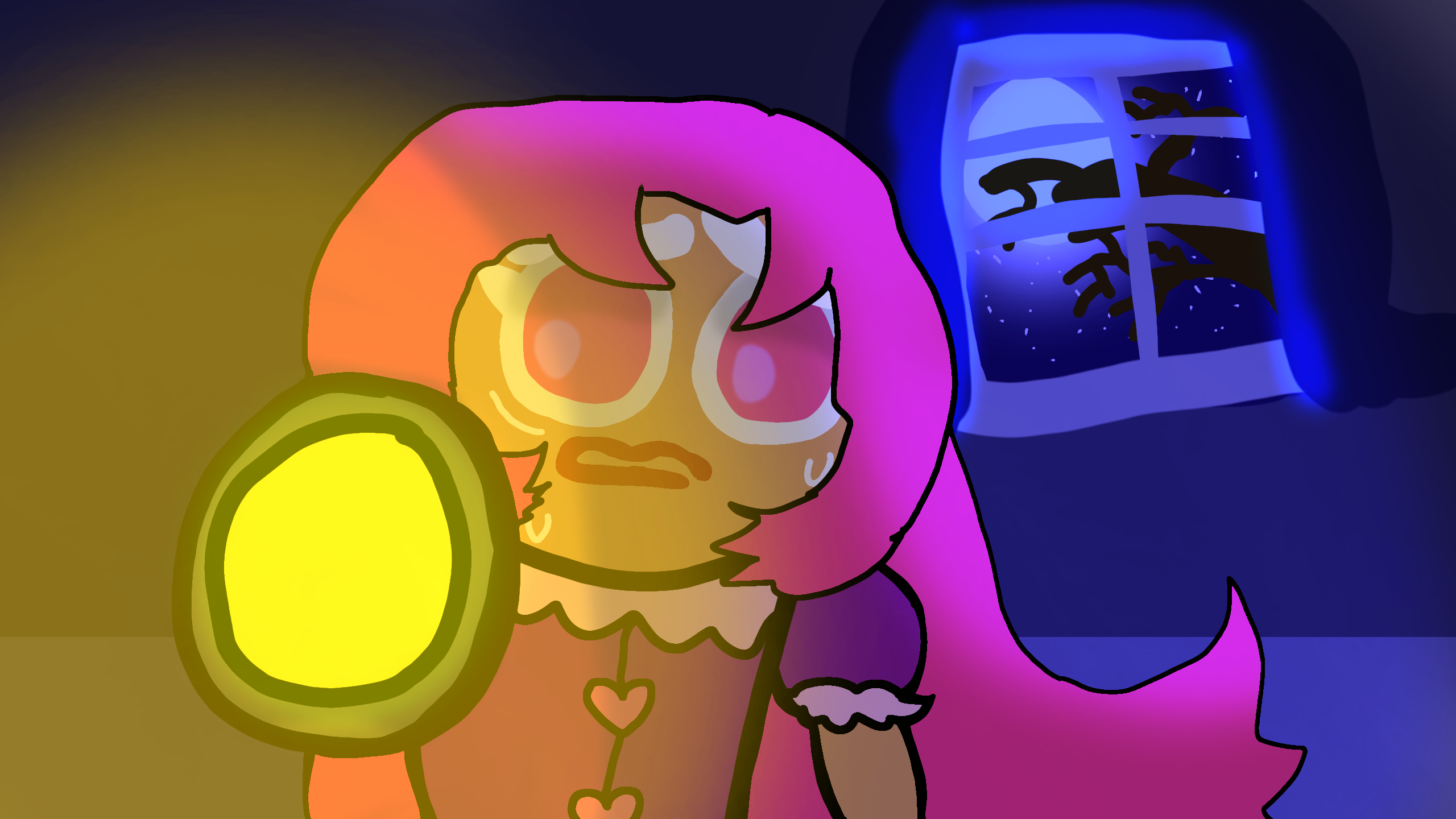 Here is a drawing I made with Hollyberry Cookie, showing her fearfully holding a flashlight, all the while trying go find her way through the darkness. By the way, she's babysitting a young Cookie, a boy called Watermelon Yogurt Cookie, with Dark Cacao Cookie helping her babysit the child. He got possessed by a demon, and so Dark Cacao drove it out by yelling "Devil be out!" Hope you like, I wanna see really cool ones! :D