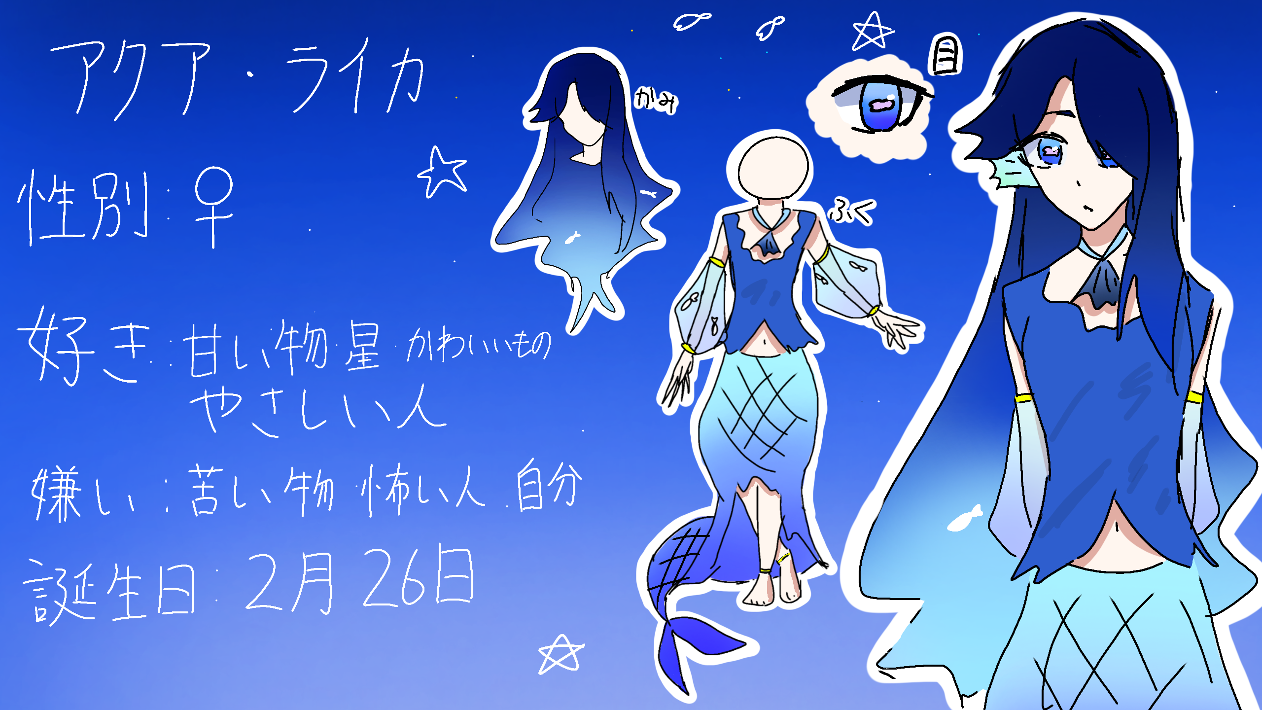 とても穏やかで優しい天然でみんなのことが大好き、つい甘やかしちゃう!ダメなことでも、うん仕方ないね、といい基本何でも許してくれる。だが、自分のことはとても嫌いで、この空間を出で死のうか少し迷ってる、でも死ぬのは怖いから死ねない。
