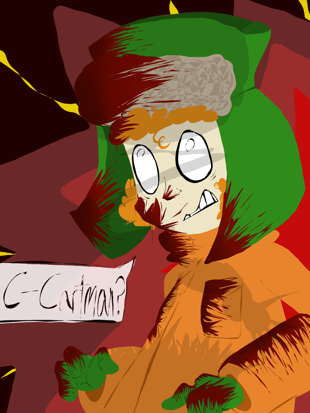 i might make more posts about this au it's very fleshed out and made by me being all the way back in like 2020 if i remember correctly, i dont have a lot of the original drawings/designs, but so far I've found kyle end + his begining design (the one your seeing right now), Kennys, Erics and i only have some of Stans. if u wanna see more tell me and i will share more and make non-canon comics #southpark #au #kyle #eric #cartman #gore #blood