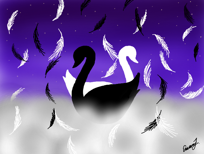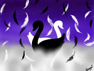 Two swans swimming through a sea of clouds. Took about half an hour and I was inspired by Swan Lake when doing this piece.