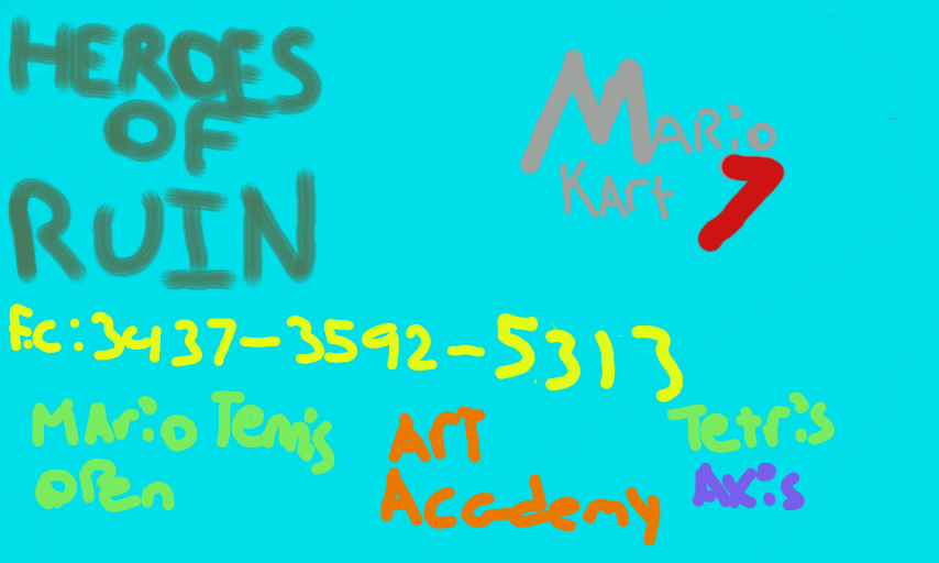 These are my 3ds games that festure the online mode: Heroes of Ruin, Mario Kart 7, Mario Tennis Open, Art Academy: Lessons for everyone and Tetris Axis. I keep getting new games so if you want to recommand me games, feel free to do it.